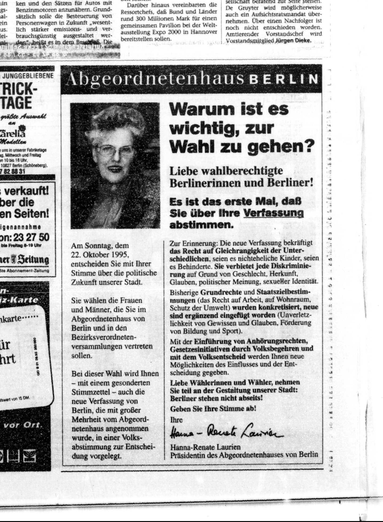 Anzeige der Parlamentspräsidentin in den Berliner Tageszeitungen am 22.10. 1995.(Plenarprotokolle und Gesetzesentwürfe sind online auf pardok.de und auf Papier im Archiv des Abgeordnetenhauses von Berlin zu finden)